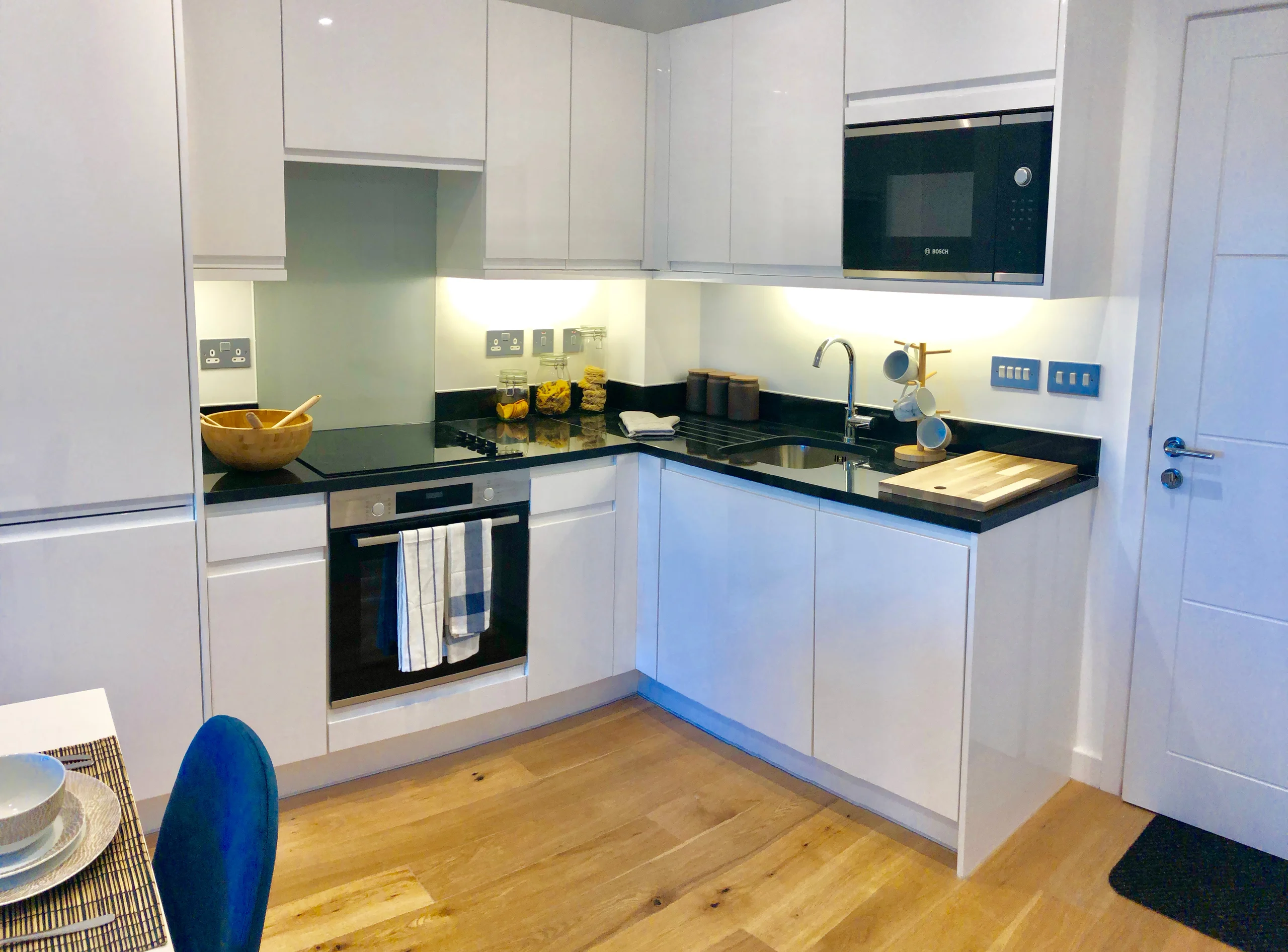 Our open plan kitchens come with fully integrated Bosch appliances throughout, including oven, hob, extractor hood, microwave, and washing machine.